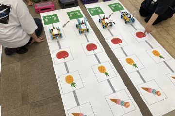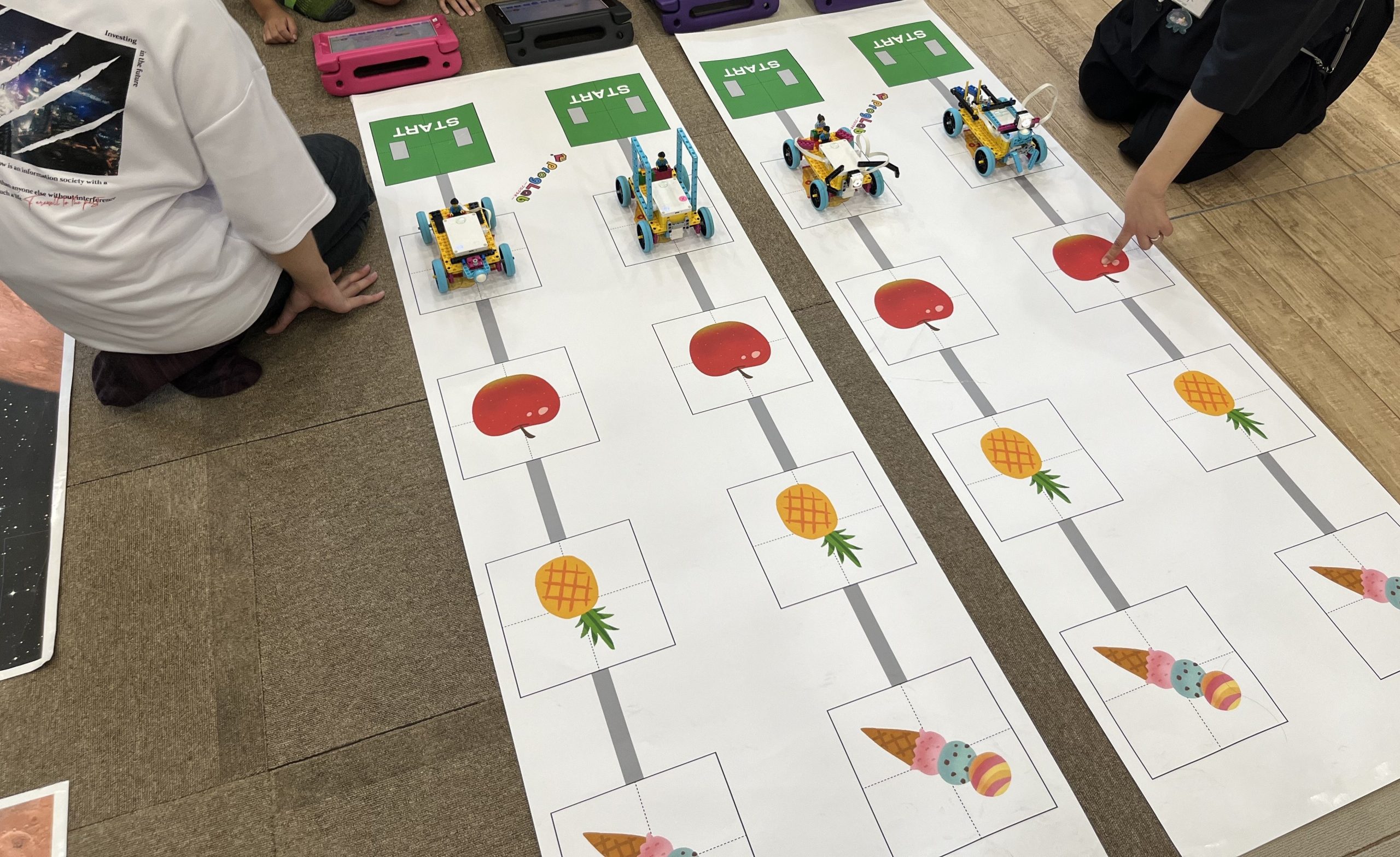 机の上でうまく動かせるようになったら、いよいよ広い場所で習熟度に合わせた『ミッション』にチャレンジします。低学年のお子さまは、食べ物の描かれたシート上で車を動かし、指定された物をお買い物してスタート地点に戻ります。高学年のお子さまは、宇宙の描かれたシート上で、地球から火星を目指して車を動かします。実際に、大きなシート上を走らせようとすると、思った通りに動かないこともあり、皆さま試行錯誤を繰り返しながら、楽しそうにミッションにチャレンジしていました。