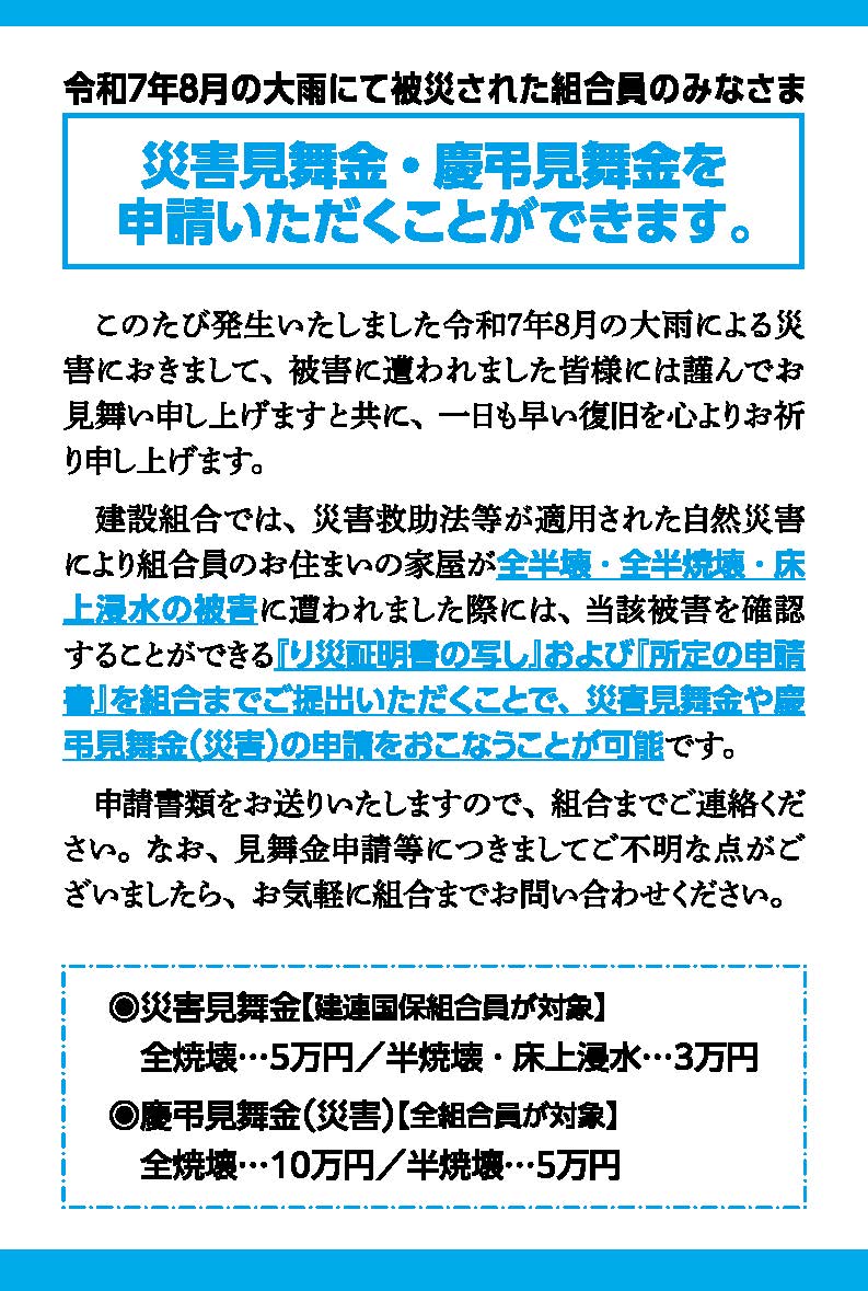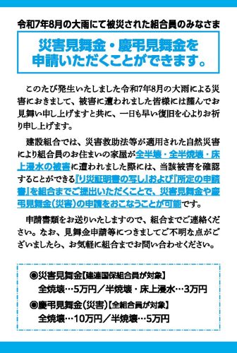 建設組合では令和7年8月の豪雨にて被災された組合員の皆さまへのご対応につきまして、災害救助法が適用された該当地域にお住まいの組合員の住家が『全半壊・全半焼壊・床上浸水』の被害に遭われました際には、当該被害を確認できる【り災証明書の写し および 所定の申請書】を組合までご提出いただくことで、災害見舞金や慶弔見舞金(災害)の申請をおこなうことが可能です。