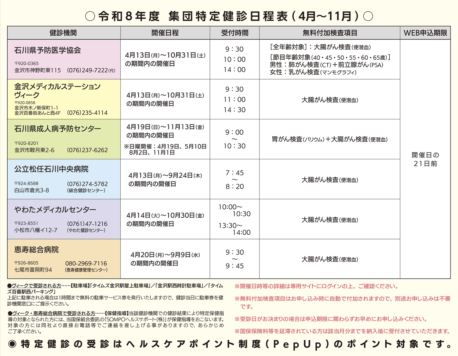 〇実施健診機関:(一財)石川県予防医学協会/金沢メディカルステーション ヴィーク/(公財)石川県成人病予防センター/公立松任石川中央病院/やわたメディカルセンター/恵寿総合病院