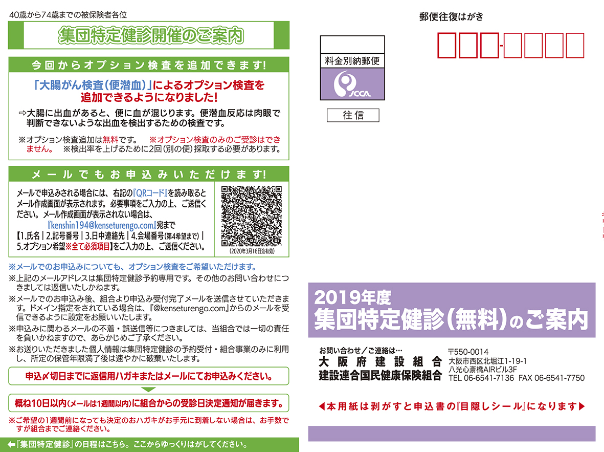※お送りいただきました個人情報は集団特定健診の予約受付のみに利用し、所定の保管年限満了後は速やかに破棄いたします。