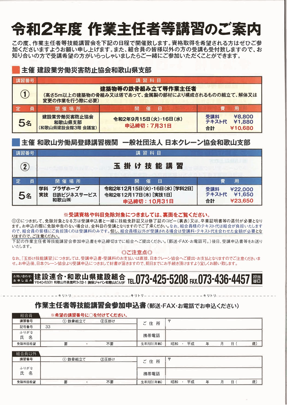 この度、和歌山県建設組合におきましてはご加入の組合員様を対象と致しまして、「建築物等の鉄骨組み立て等作業主任者技能講習」「玉掛け技能講習」の作業主任者技能講習会を開催致します。