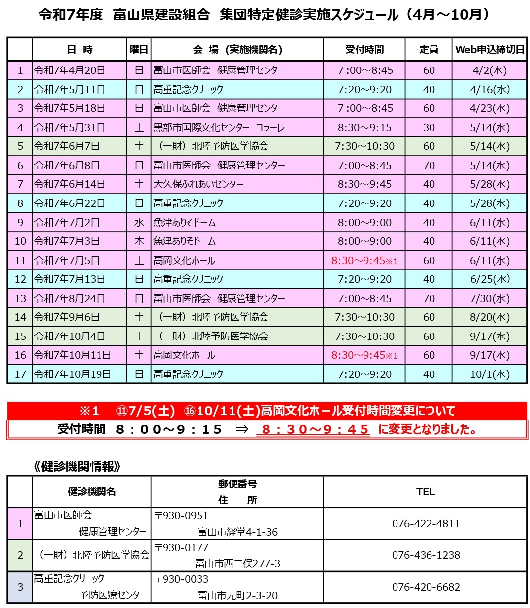 ⑪ 7/5(土)および ⑯10/11(土)高岡文化ホール(富山市医師会健康管理センター)受付時間が一部変更となりました。