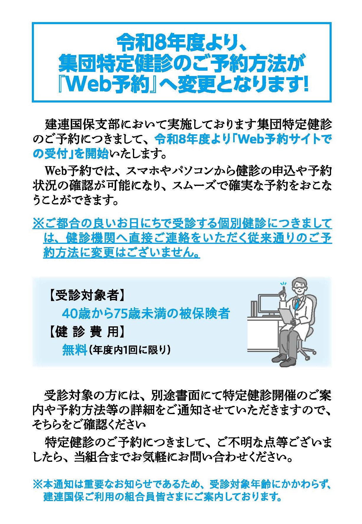 ※契約健診機関にてご都合の良いお日にちで受診する『個別健診』につきましては、各健診機関へ直接ご連絡をいただく従来通りのご予約方法に変更はございません。